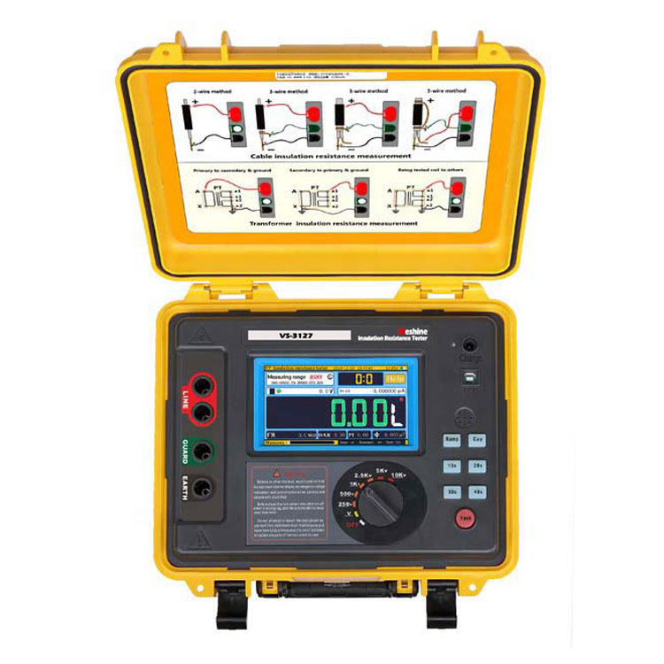 Weshine® VS-3127 се напојува со батеријаТест на мегометарсо дигитален и аналоген лак дисплеј, дизајниран за тестирање на отпорност на изолација на висок напон при одржување и сервисирање на кабли, машини за ротирачки постројки, трансформатори, разводни уреди и индустриски апликации.
